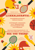 Marraskuun liikkalauantai, teemana Perinnepelit ja -leikit. Pelataan esim. Lipunryöstöä, Hirvipalloa, Väriä, Peiliä jne. Toinen puoli salista vapaassa käytössä. Lapset ja aikuiset joukolla mukaan liikkumaan! Liikuntasalin ovi C, soita kelloa.